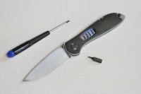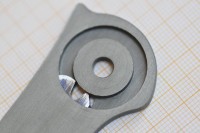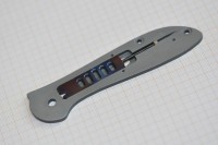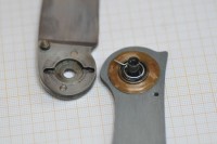 12.8.2012 Klinge, Feder und Platine rechts. Die Klingenlagerung erfolgt über die Achse und die Messing-Lagerhülse